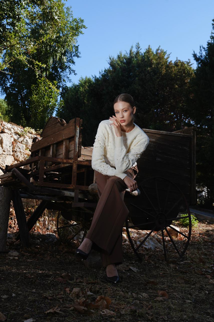 A soft ivory knit pullover designed with delicate embellishment detailing for a refined, feminine touch. Cozy yet elevated, it pairs effortlessly with tailored trousers or skirts for polished everyday and seasonal styling.