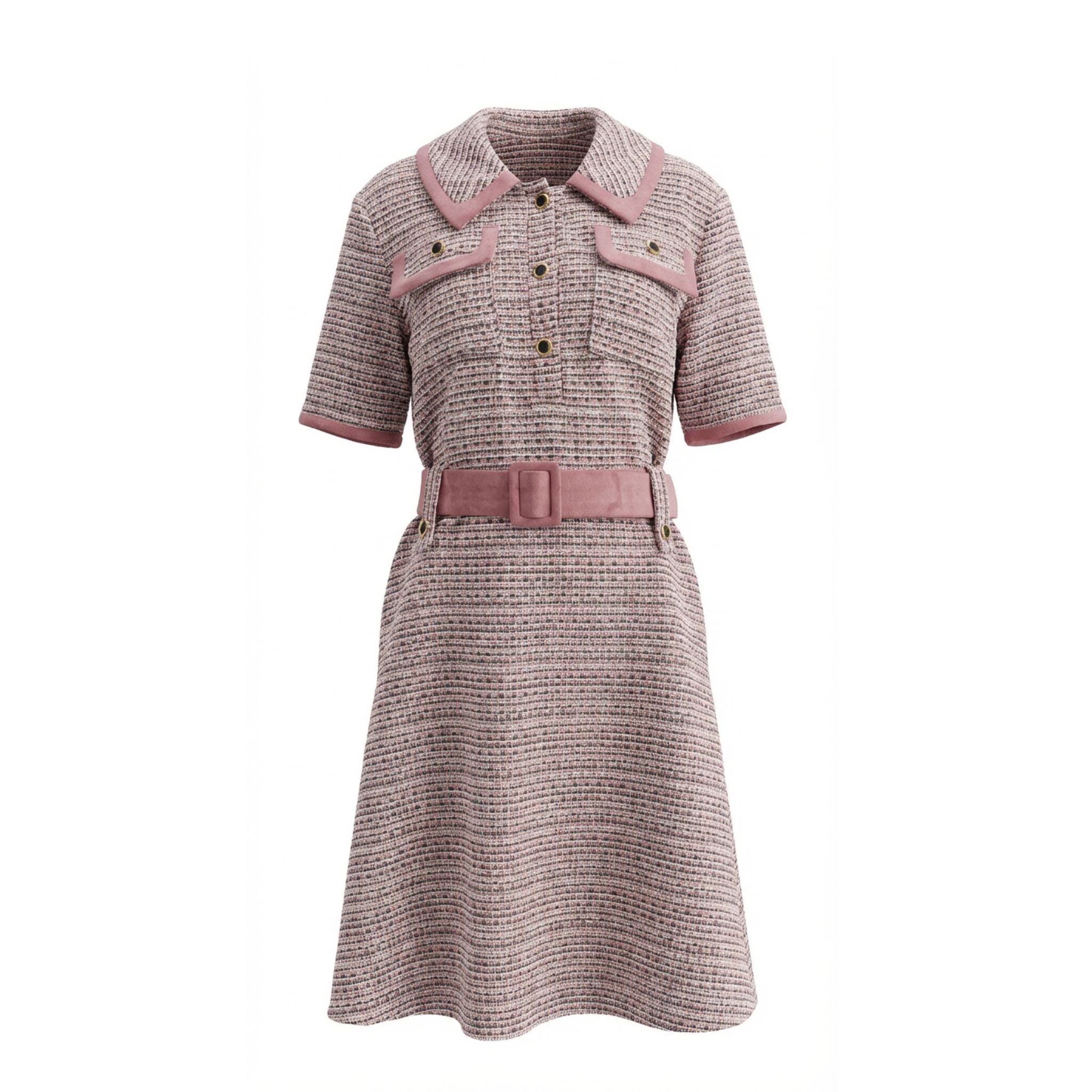 Designed for refined daywear and polished occasions, this tweed belted midi dress blends classic elegance with modern femininity. Featuring a structured silhouette and soft, feminine tones, it offers timeless versatility and quiet luxury, transitioning effortlessly from city styling to elevated social events.